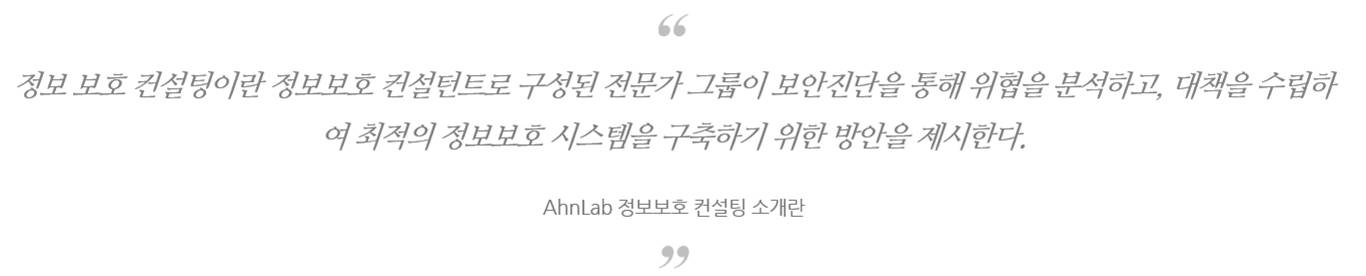 Ahnlab홈페이지,"서비스 > 정보보호컨설팅> 소개 및 특장점",https://www.ahnlab.com/kr/site/product/consultInfo.do,