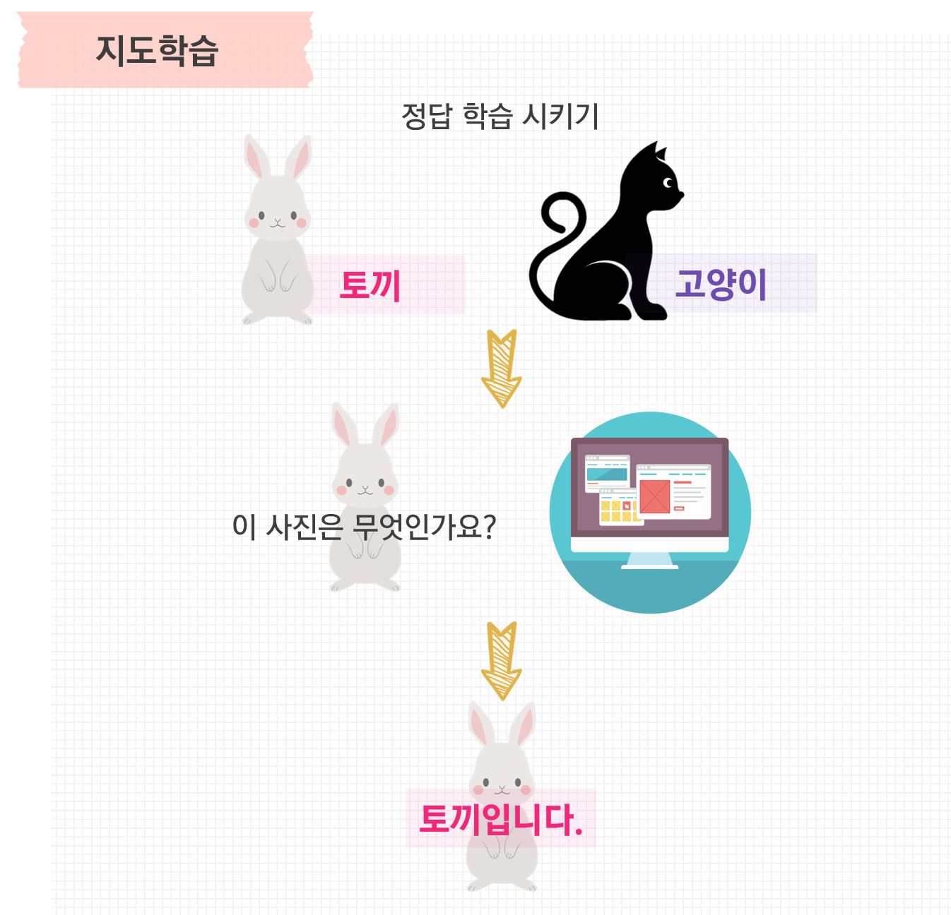 지도학습이란 정답이 주어진 상태에서 학습을 하는 알고리즘을 말합니다. 다음 그림처럼 고양이와 토끼의 사진들을 주고 각각의 사진들이 고양이인지 혹은 토끼인지 정답을 알려줍니다. 그 후 어떠한 사진을 주면 이 사진이 고양이인지 혹은 토끼인지 맞추는 것이 바로 지도학습입니다.