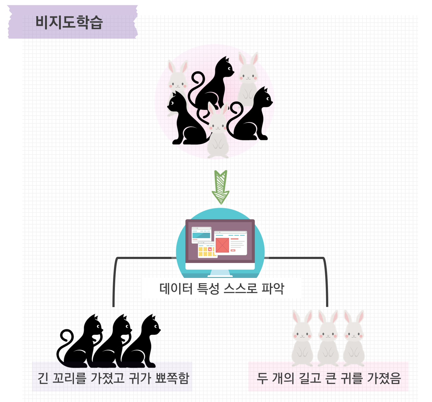 비지도 학습의 핵심은 '스스로'라고 말할 수 있습니다. 비지도학습이란 정답이 주어지지 않은 상태에서 데이터의 특성을 학습하여 스스로 패턴을 파악하는 알고리즘을 말합니다. 사람들이 정답을 하나하나 입력하는 수고를 덜어주기 때문에 최근에 집중적으로 연구되는 분야입니다. 가장 오랜 시간 동아 연구되어온 것이 군집화(Clustering)입니다. 다음 그림을 참고하면 이해가 쉽습니다. 고양이와 토끼의 사진을 보고 사람들은 두 개의 긴 귀를 가진 동물과 긴꼬리를 가진 동물로 구분할 수 있습니다. 기계도 이처럼 데이터의 특성을 파악해서 정답을 알려주지 않아도 비슷한 사진으로 분류하는 것을 군집화라고 합니다.