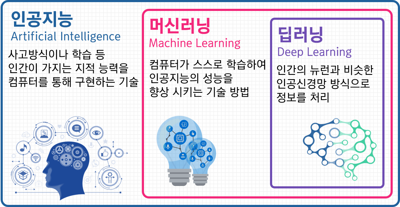인공지능, 머신러닝, 딥러닝의 개념 및 관계를 다음 그림을 보면 쉽게 이해할 수 있습니다.