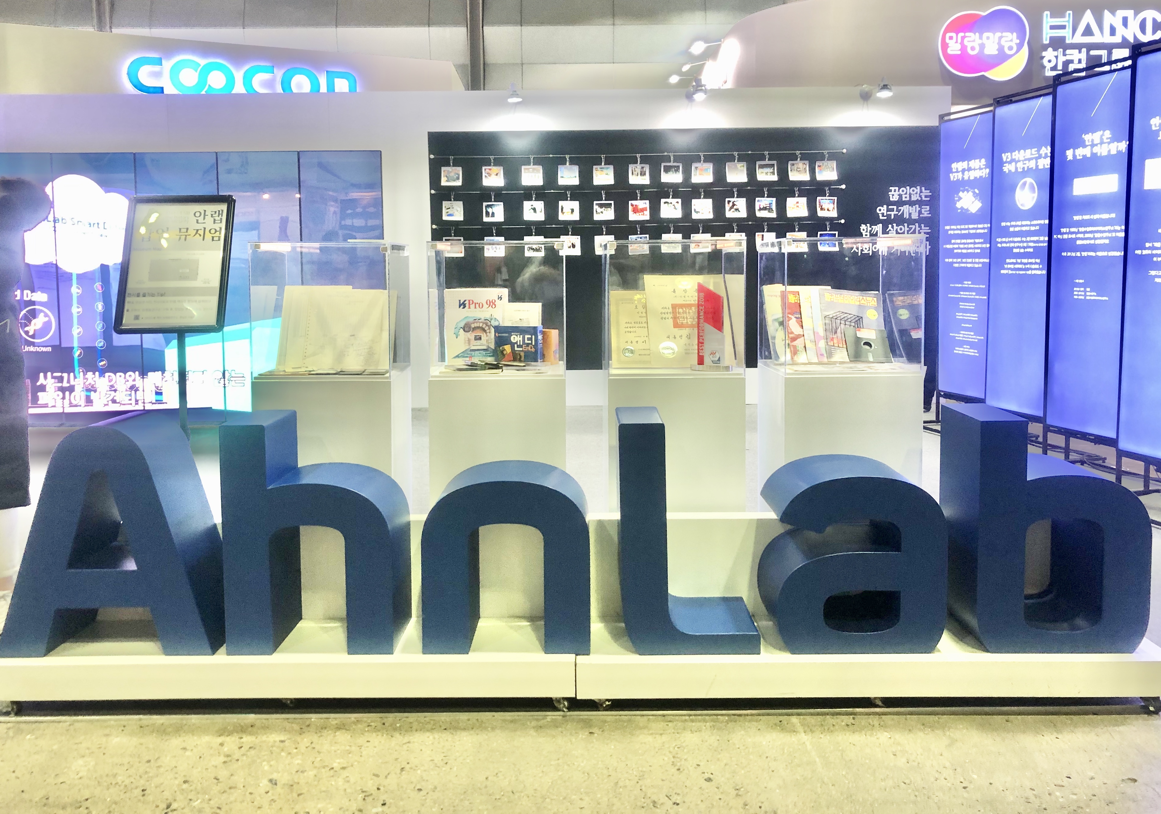 안랩 (AhnLab) 부스에서는 체험형 콘텐츠 보다는 안랩의 역사를 보여주는 전시를 기획해, 안랩의 시작인 안철수 연구소때의 모습부터 지금의 안랩까지의 기록을 흥미롭게 감상할 수 있었습니다.