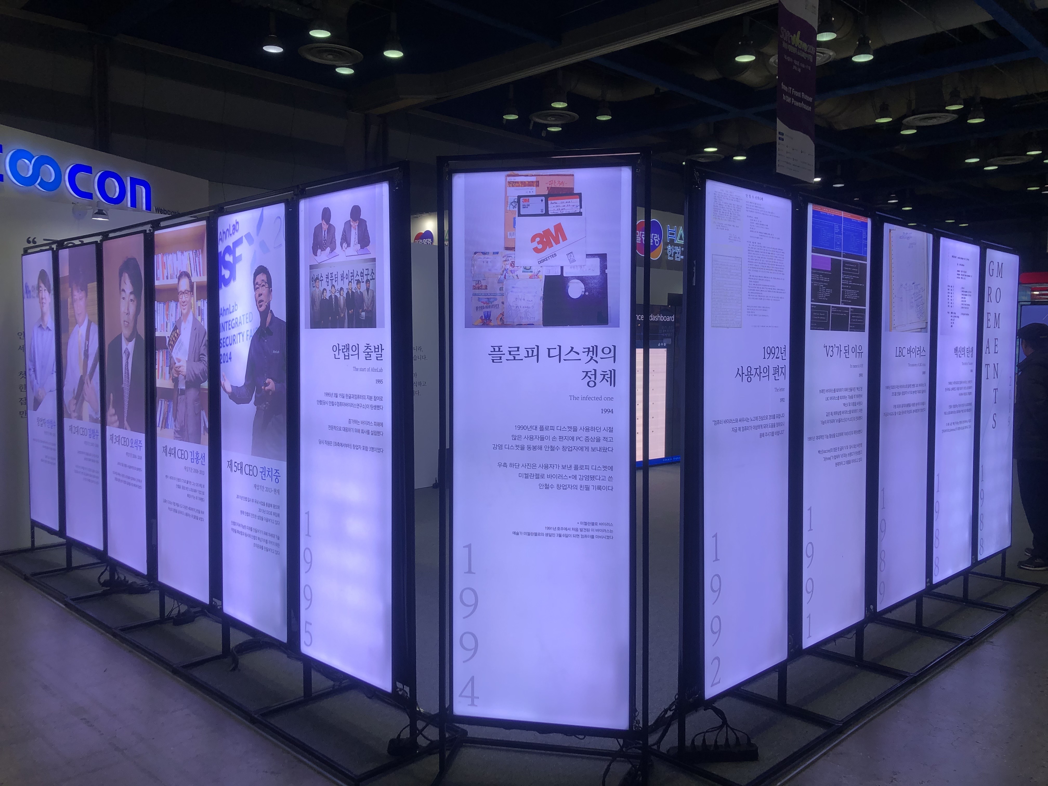 특히 역대 CEO의 연혁이나, 지금보다 보안 소프트웨어의 중요성을 간과했던 과거에 컴퓨터 바이러스와 싸웠던 흔적과 기록들을 나열하여, 지나가는 사람들의 눈길을 붙잡았습니다.