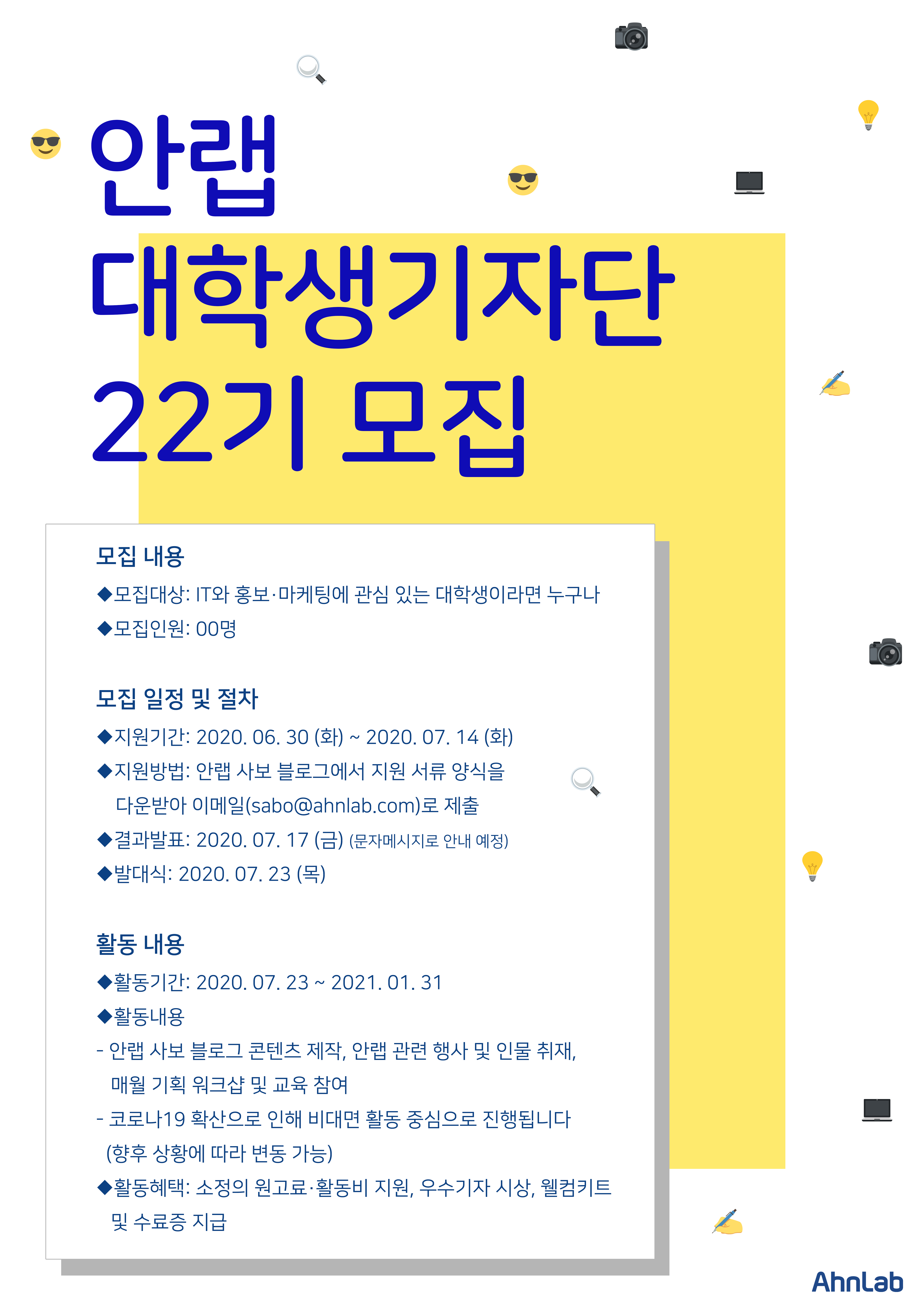 정보보안기업 안랩의 사보를 함께 만들어갈 안랩 22기 대학생 기자단을 모집합니다!