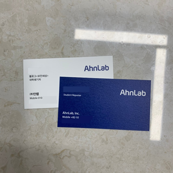 첫 번째는 기자단 명함입니다. 정말 많아서 주변인들에게 드려도 넉넉한 양이었는데요, 안랩 하면 바로 떠오르는 파란색이 인상적입니다. 한쪽 면은 흰색 배경에 한글 이름이, 반대쪽 면은 파란색 배경에 영어 이름이 적혀있습니다.