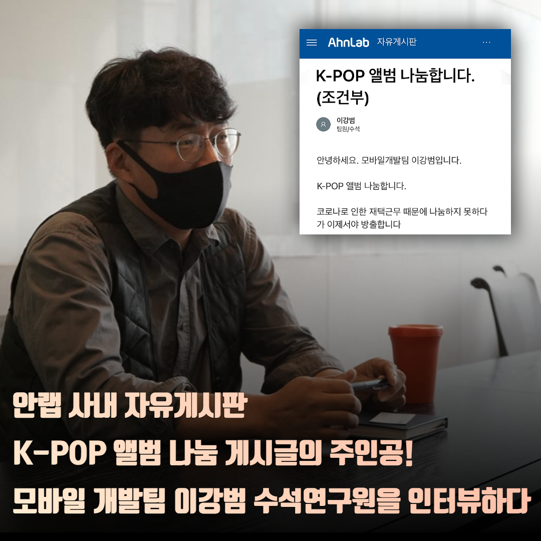 2021년 어느 날, 안랩 사내 자유게시판에 “K-POP 앨범 나눔 합니다. (조건부)”라는 제목의 게시글이 올라왔습니다.