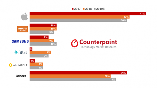 포화 상태의 주춤한 스마트폰 시장과 다르게 스마트워치는 꾸준한 성장을 이어가고 있다. 글로벌 시장조사업체 카운터포인트에 따르면, 2018년 스마트 워치 판매량이 전년 동기 대비 41% 증가한 것으로 나타났다. 애플이 37%의 점유율로 압도적으로 시장 1위를 차지하고 있는 가운데 아이무(imoo)가 10%로 2위를 삼성이 9%로 그 뒤를 이어가고 있다.