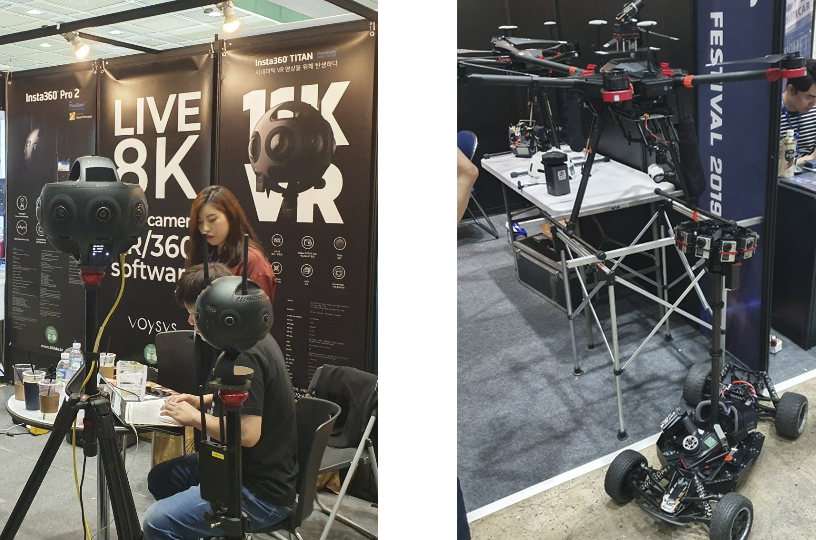 이러한 콘텐츠들을 만들기 위한 기술들 역시 전시되었습니다. 360도 카메라의 대표주자인 Insta의 카메라와 더불어 다양한 촬영을 위해 여러 방식으로 개조한 카메라도 볼 수 있었습니다.