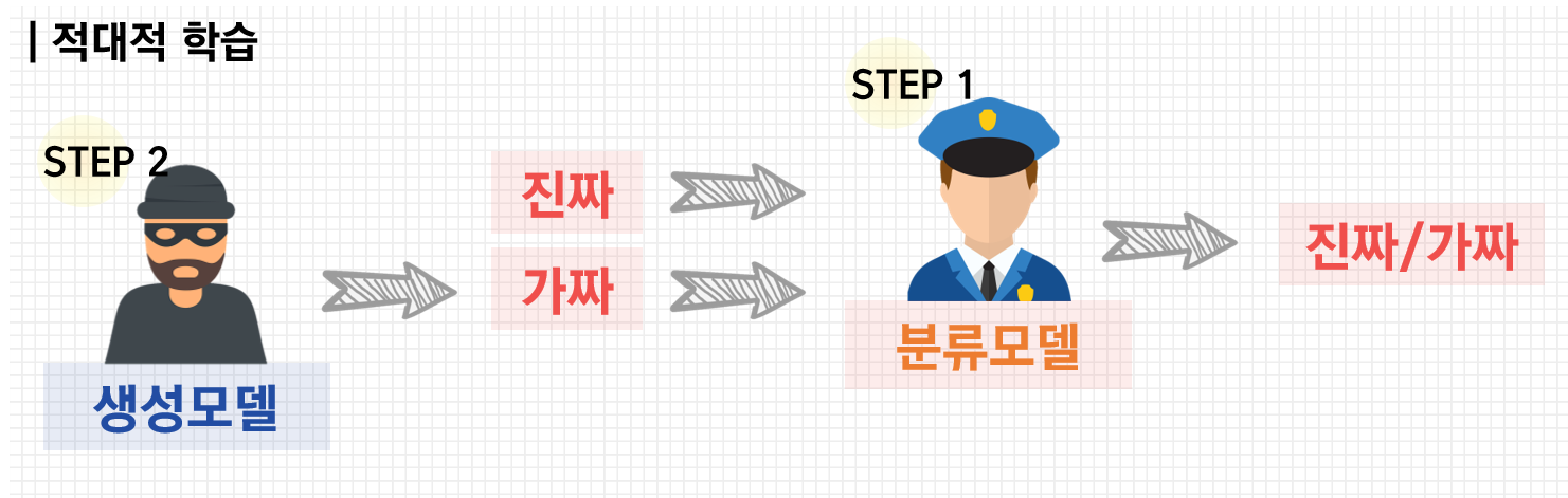 적대적 학습은 분류모델을 먼저 학습시킨 후 학습된 분류모델을 속이는 방향으로 생성모델을 학습시킨다. 분류 모델은 진짜 데이터를 입력해서 해당 데이터를 진짜로 분류하도록 학습하는 것과 생성모델에서 생성한 가짜 데이터를 입력해서 해당 데이터를 가짜로 분류하는 학습을 하게 된다. 그 다음에는 분류 모델을 속이는 방향으로 생성모델을 학습시킨다. 생성모델에서 만들어 낸 가짜 데이터를 판별 모델에 입력하고, 가짜 데이터를 진짜라고 분류할 만큼 진짜 같은 데이터를 만들도록 생성모델을 학습시킨다. 이러한 학습이 반복되면서 분류 모델과 생성 모델이 서로를 적대적인 경쟁자로 인식하여 모두 발전할 수 있게되고, 진짜와 완벽히 유사한 가짜를 만들 수 있다.