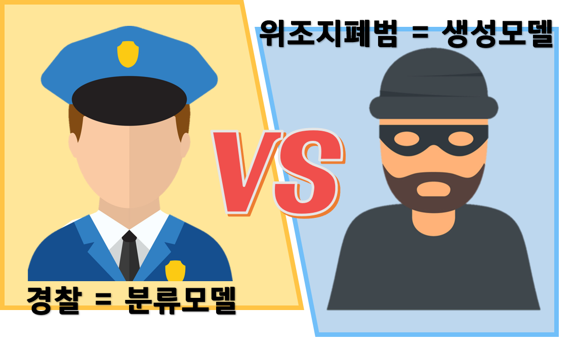 위조지폐범(생성모델)은 진짜 지폐와 최대한 비슷하게 만들어서(생성) 가능한 경찰을 속이려고 노력한다. 반면 경찰(분류모델)은 진짜 화폐와 가짜 화폐를 완벽히 판별(Classify)하여 위조지폐범을 검거하는 것을 목표로 한다. 이러한 경쟁이 계속될 때마다 위조지폐팀은 경찰을 속이지 못한 데이터를, 경찰은 위조지폐범에게 속은 데이터를 입력 받아 적대적으로 학습한다. 그 결과 두 팀 모두 각자의 능력이 향상되고, 결국에는 경찰이 진짜와 가짜를 구별 할 수 없을 때까지 진행된다. 즉, 이 과정이 반복되면서 위조지폐가 정교해지듯 점점 더 실제에 가까운 거짓 데이터를 생성하게 된다.