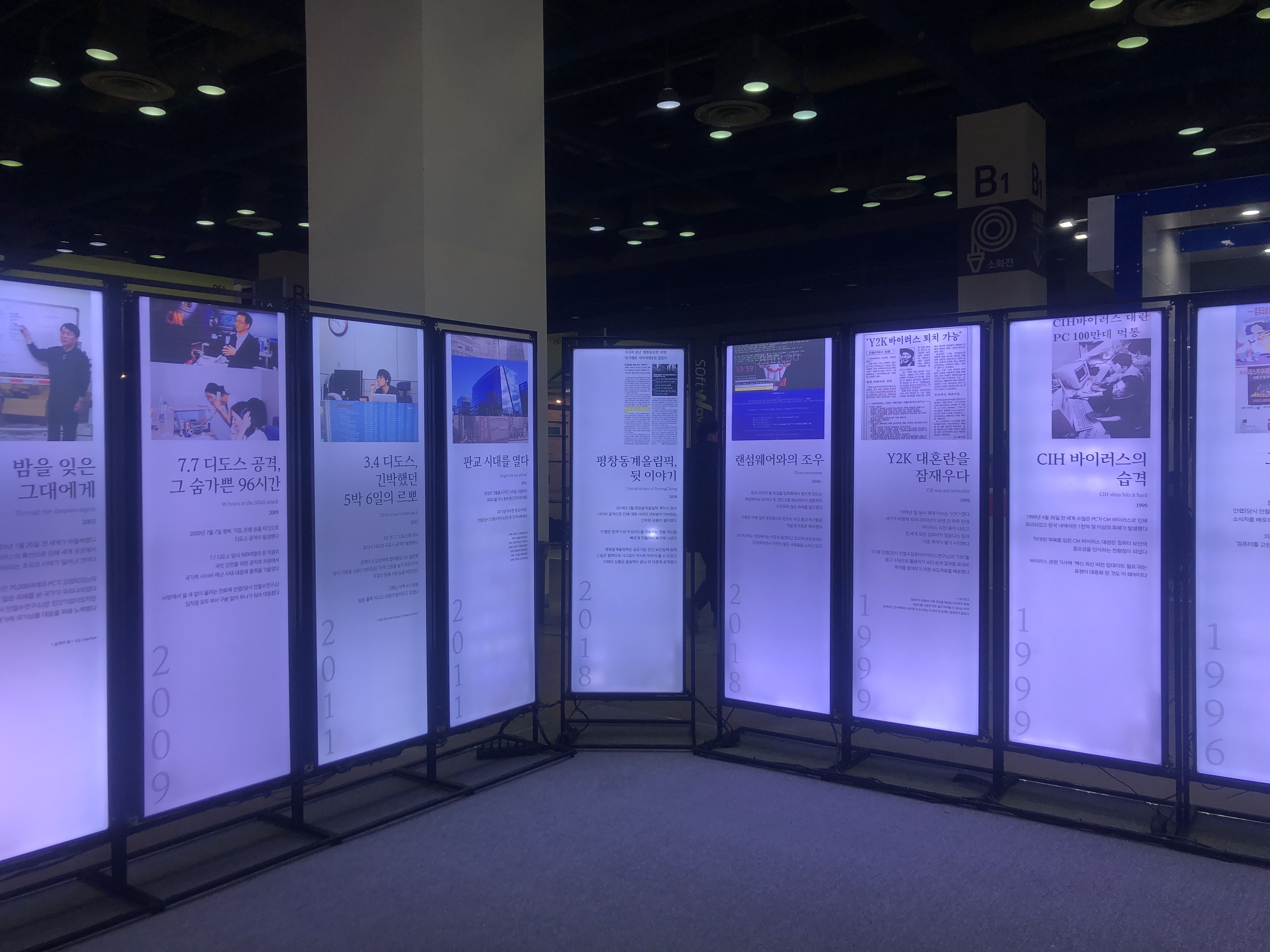 특히 역대 CEO의 연혁이나, 지금보다 보안 소프트웨어의 중요성을 간과했던 과거에 컴퓨터 바이러스와 싸웠던 흔적과 기록들을 나열하여, 지나가는 사람들의 눈길을 붙잡았습니다.