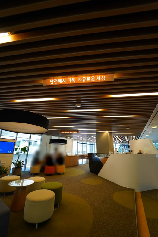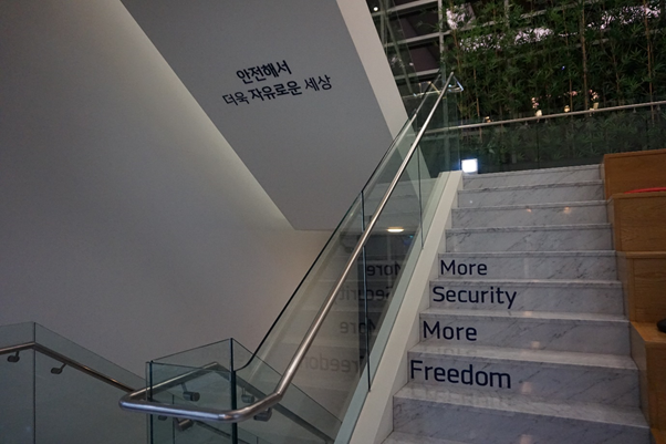 또, 안랩 사옥 곳곳에서 안랩의 비전인 ‘안전해서 더욱 자유로운 세상’을 볼 수 있었습니다. 주로 아무것도 없는 공간인 계단 아래쪽에 비전을 써놓아서 자주 볼 수 있도록 한 아이디어가 돋보이지 않나요?