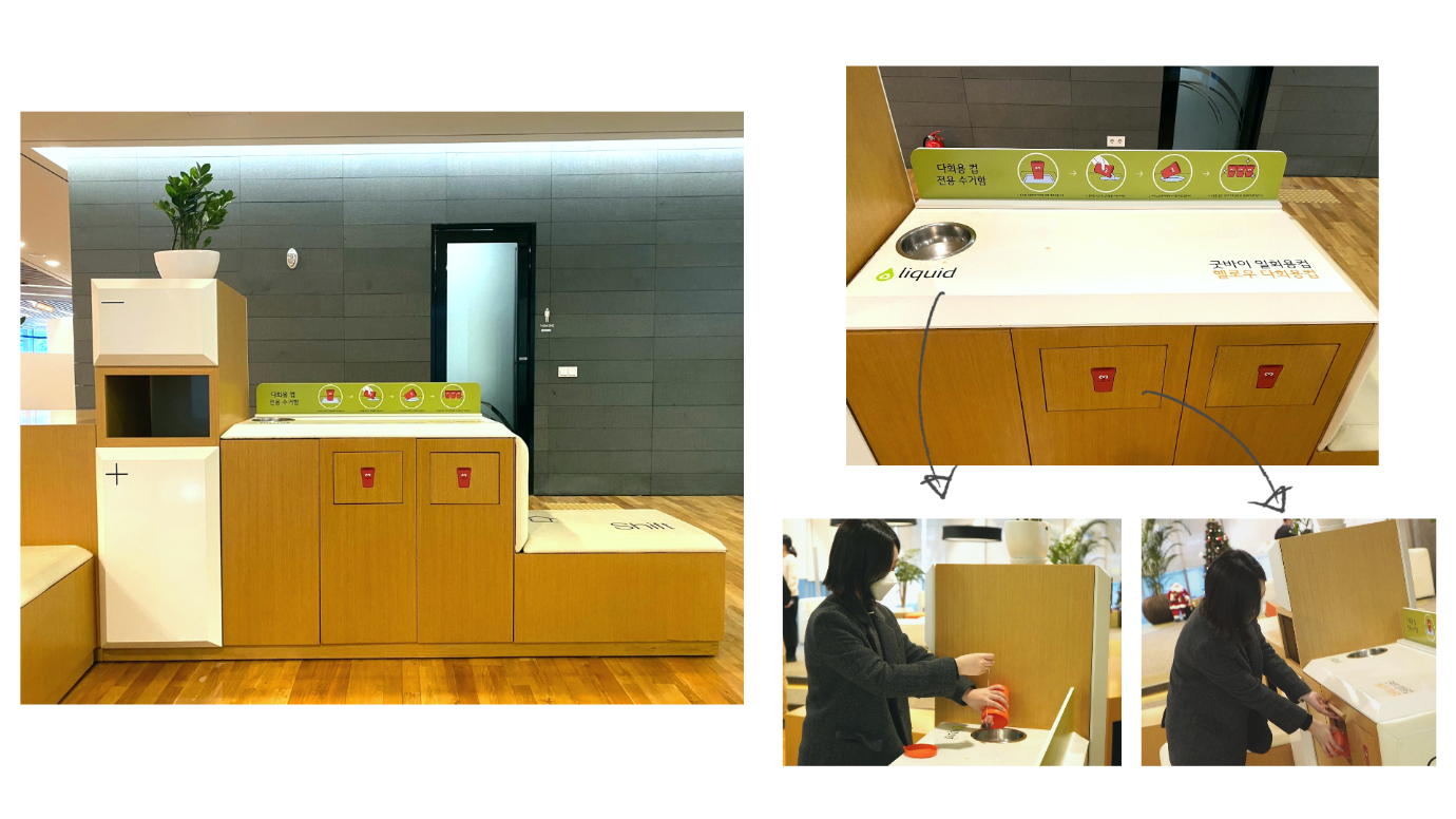 음료를 다 마신 다회용컵은 여기서 반납해야 하는데요, 기존의 일회용컵을 버리는 방법과 동일하게 컵에 남아있는 얼음과 티백 등 잔여물을 따로 버린 후, 컵은 다회용컵 회수함에 넣어 반납을 마칩니다. 이외에도 각 층마다 별도로 다회용컵 반납함이 마련되어 있어서 편리하게 컵을 반납할 수 있다고 합니다.