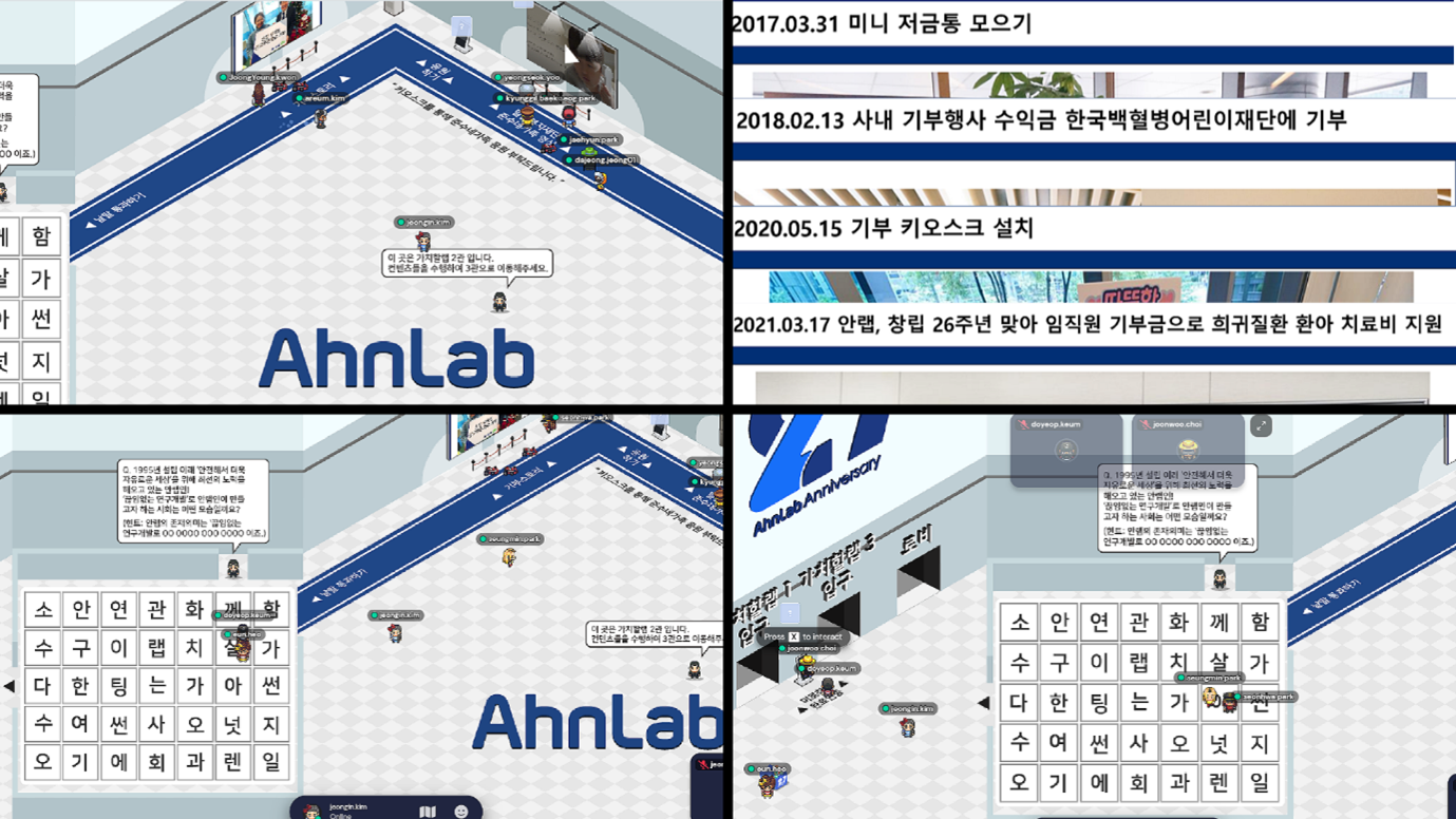 2021년 3월 11일, 안랩이 창립 27주년을 맞아 메타버스 기반의 플랫폼 게더타운에서 ‘따로 또 같이 함께하는 가치’ 비대면 행사를 진행했습니다. (참고로 안랩의 창립일은 1995년 3월 15일입니다. 매년 창립기념일은 휴일(!)이기 때문에 앞서 행사를 진행했다고 하네요!)