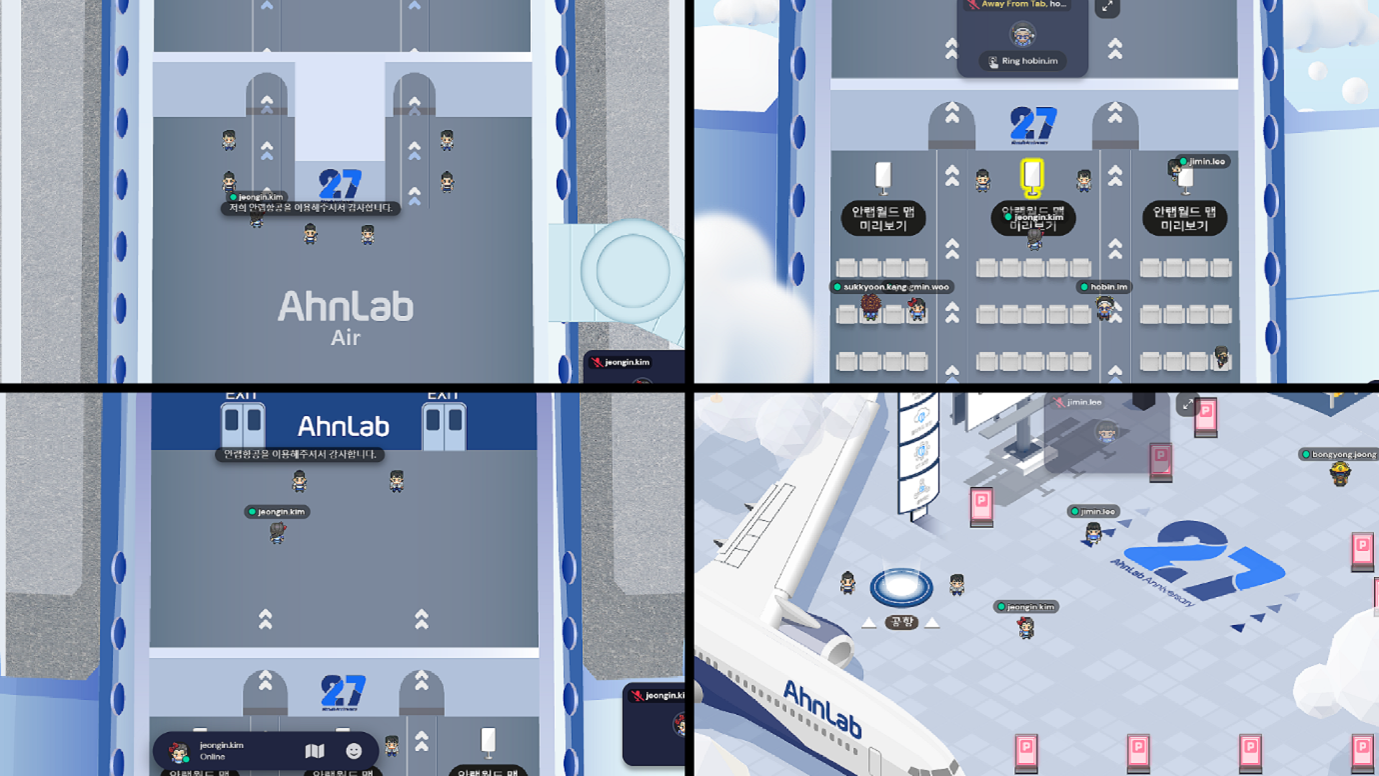 게더타운 내의 ‘안랩월드’에는 크게 [공항 라운지-비행기-판교-안랩 사옥] 이렇게 4개의 주요 공간이 구현되어 있으며, 공항 라운지에서 비행기를 탑승한 후 판교역에 하차해 안랩 사옥으로 이동하는 동선입니다.